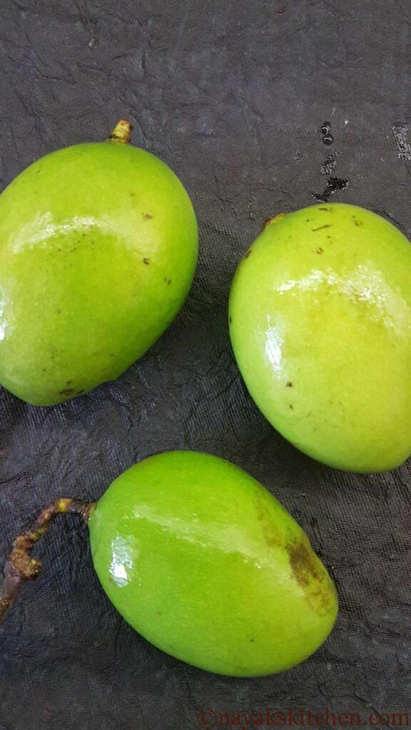 - Cut each drumstick into 4-5 pieces. Peel the outer skin and then wash. Wash the raw mango well. Similarly, peel the skin and chop into pieces.