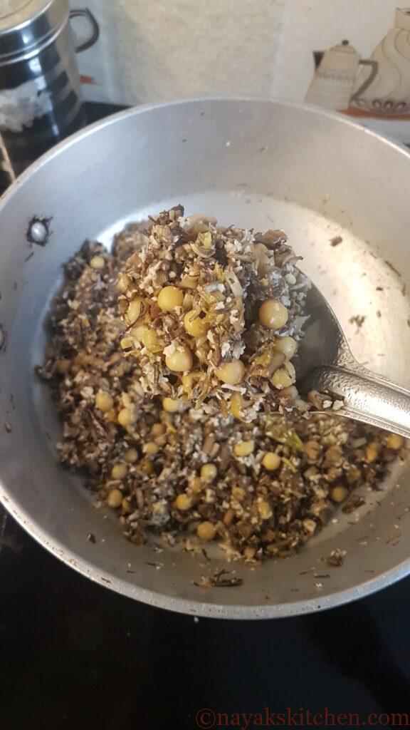 7. Add chopped banana flower and sauté well. Add a little water and cooked white peas. Cook covered till soft.
