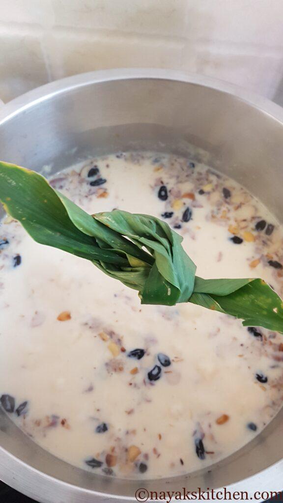 - Knot the turmeric leaf and drop it in the payasam. Cook further till a nice aroma is released and the payasam becomes thicker.